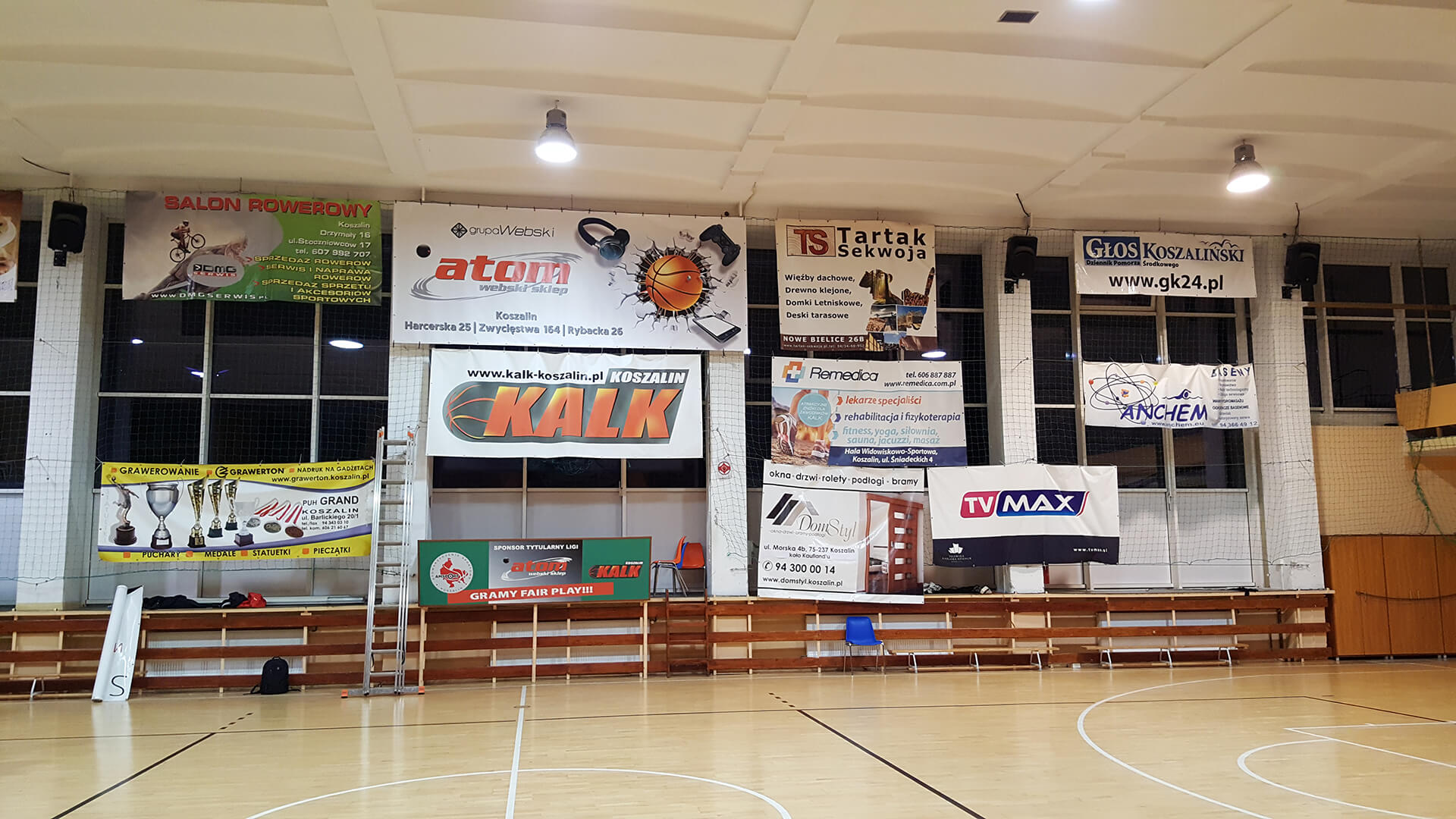 Na hali sportowej, gdzie rozgrywane są mecze Koszalińskiej Amatorskiej Ligi Koszykówki, zamontowaliśmy baner reklamowy dla Atom Webski Sklep. Projekt, wydruk i montaż zostały wykonane z uwzględnieniem specyfiki obiektu sportowego. Duży format banera zapewnia doskonałą widoczność marki podczas rozgrywek koszykarskich.