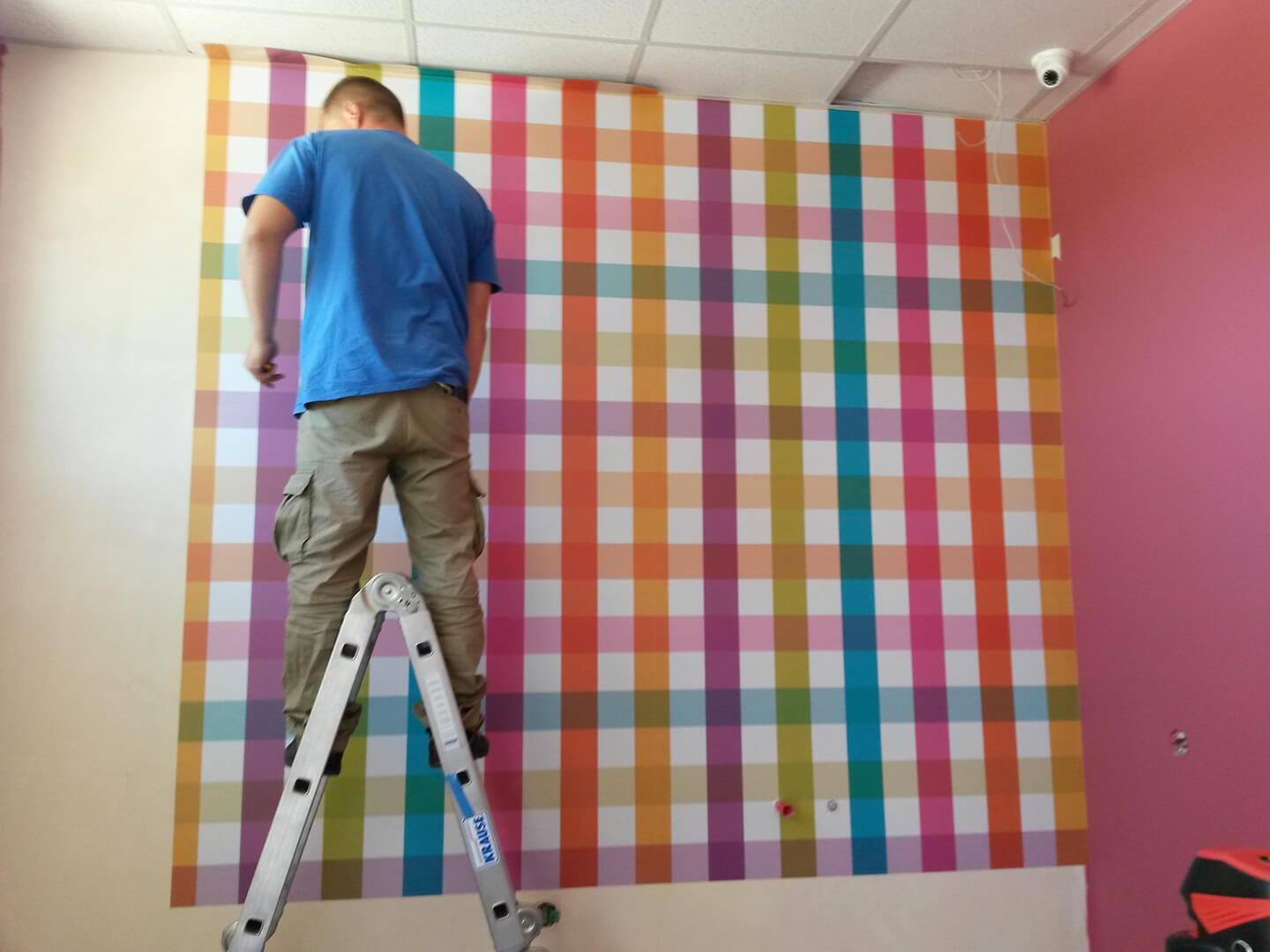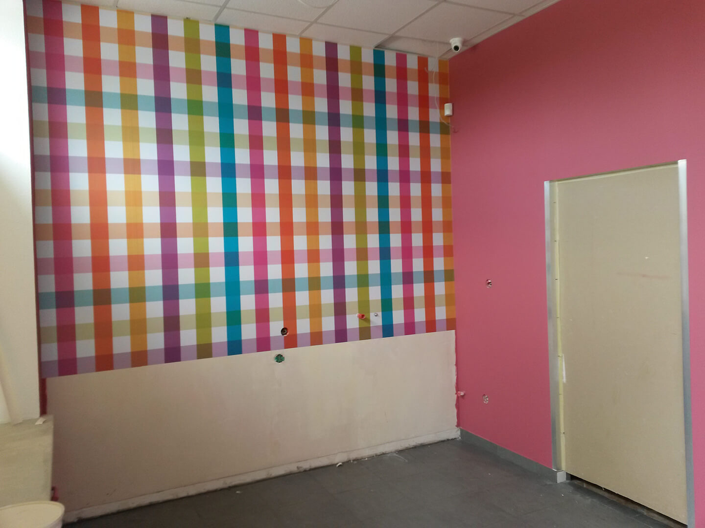 W lokalu gastronomicznym Przerwa wykonaliśmy oklejenie ścian z wykorzystaniem specjalistycznej folii z laminatem. Trwałe i odporne na czyszczenie wykończenie idealnie sprawdza się w przestrzeni barowej. Grafika nadaje wnętrzu charakterystyczny klimat i stanowi istotny element wystroju lokalu.