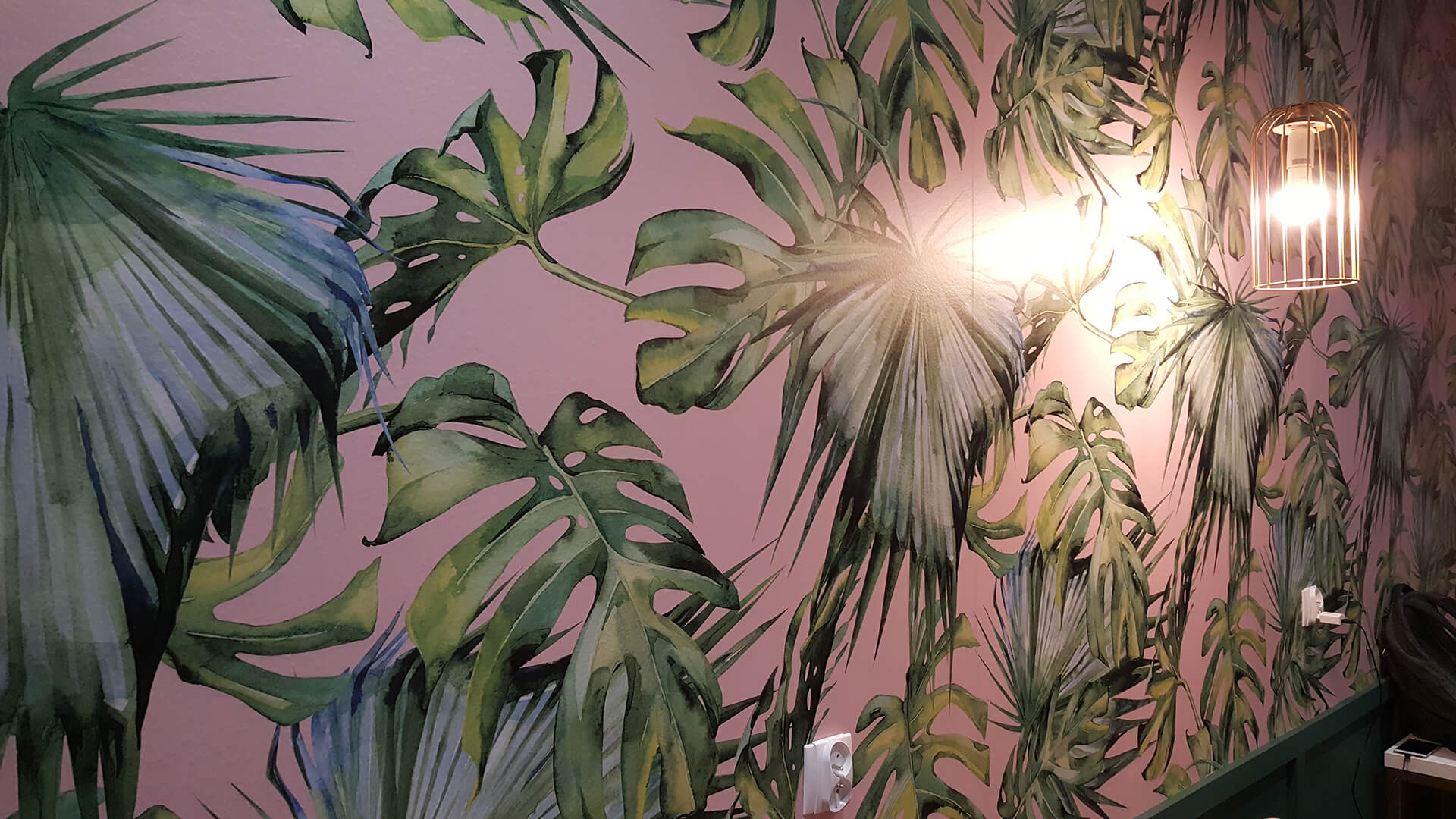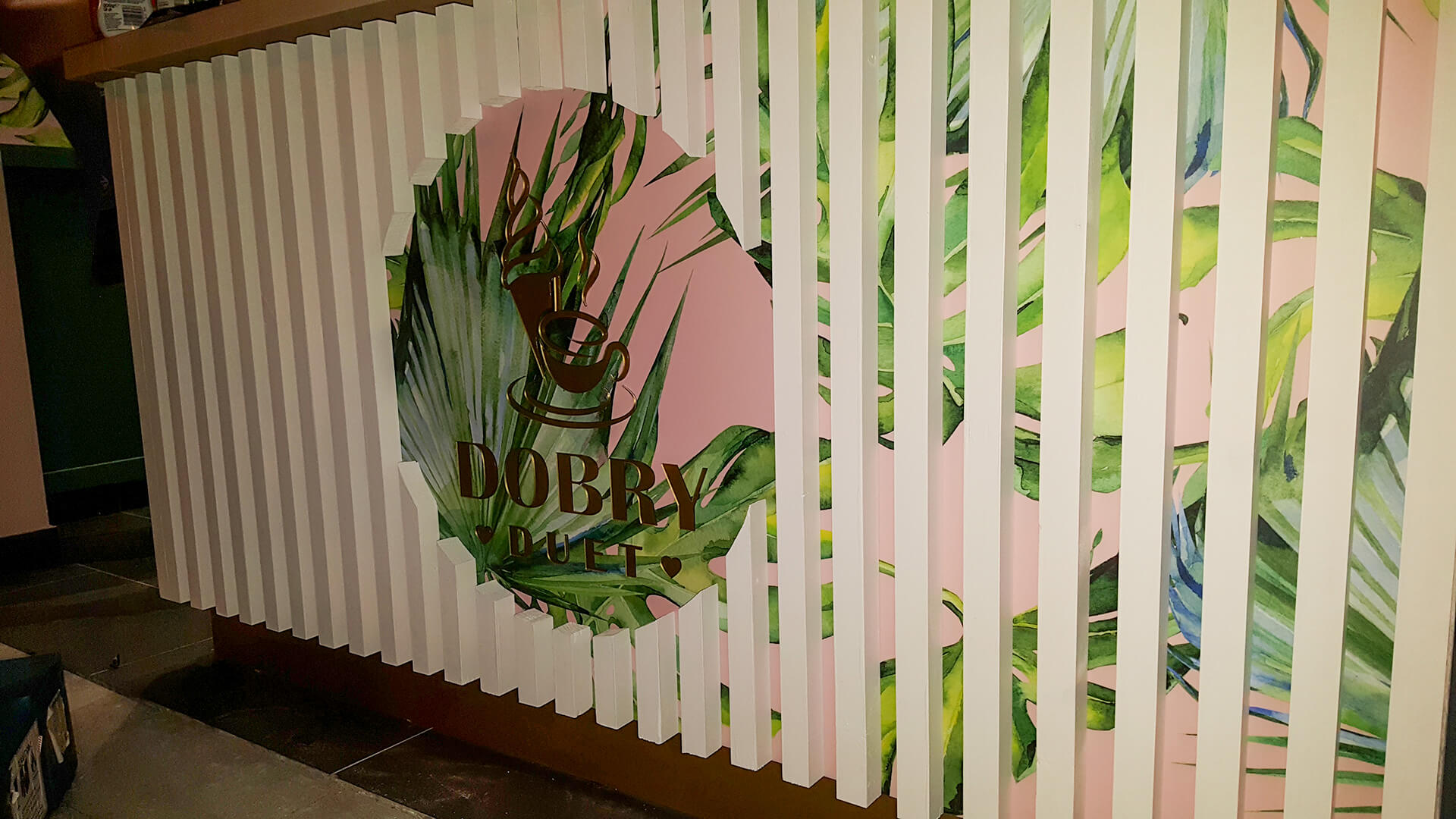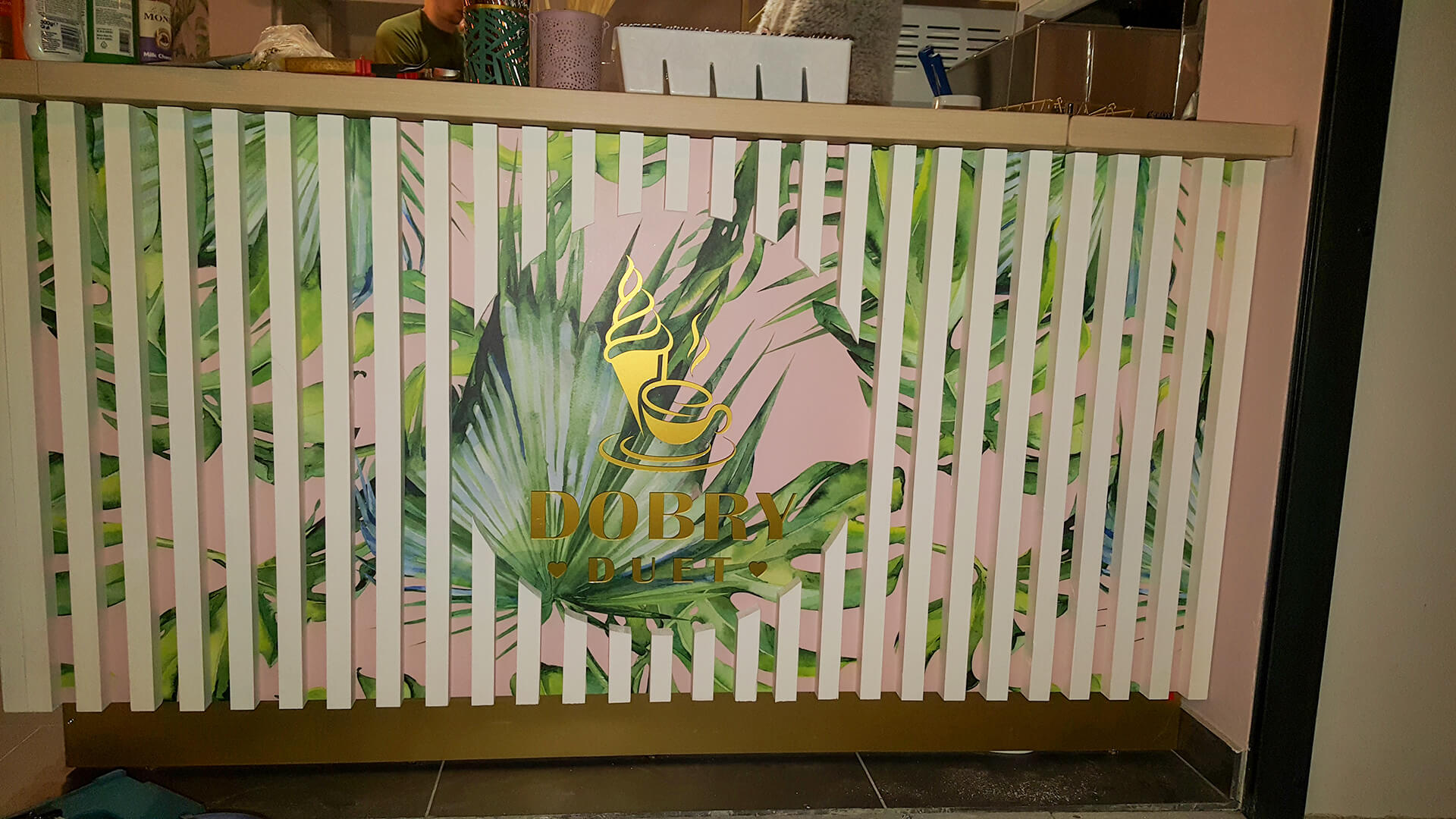 W lokalu gastronomicznym zrealizowaliśmy wieloelementowy projekt aranżacji. Ściany zostały wykończone folią z motywami floralnymi, zabezpieczoną laminatem. Na ladzie i ścianie zamontowaliśmy logo ze złotej pleksi, a na zewnątrz szyld z dibondu. Całość uzupełniają tablice menu. Spójna stylistyka wszystkich elementów tworzy przytulną atmosferę kawiarni z lodami i kawą.