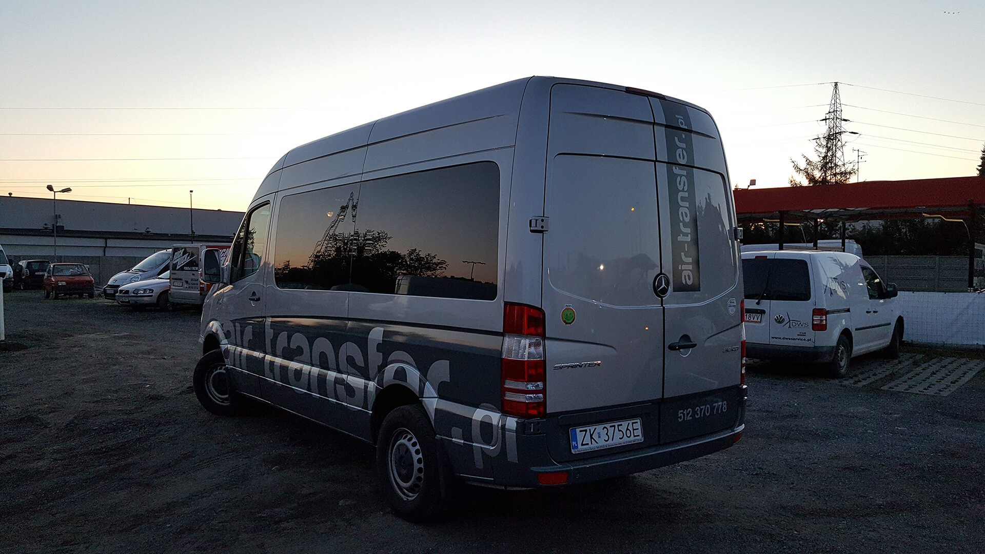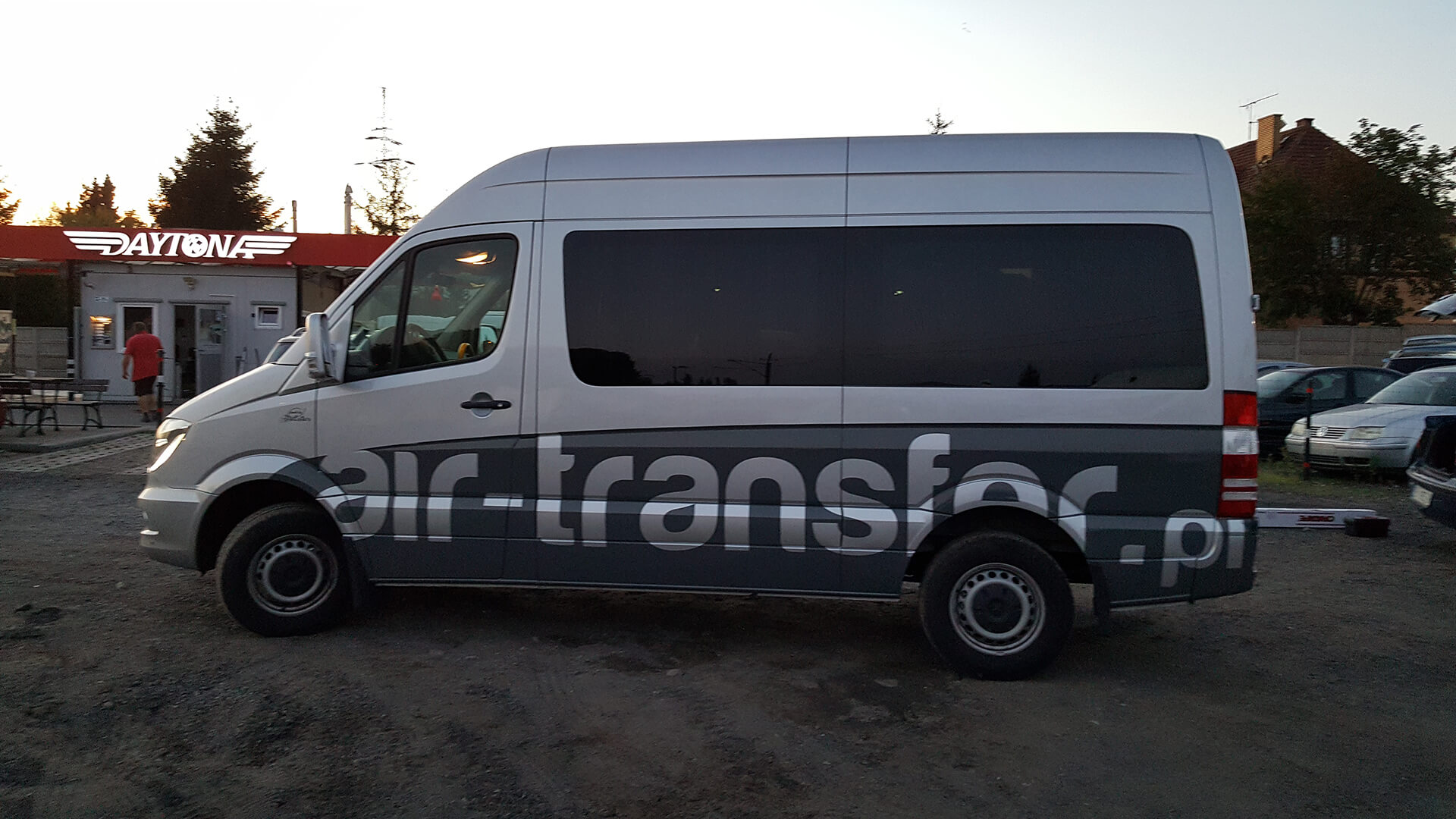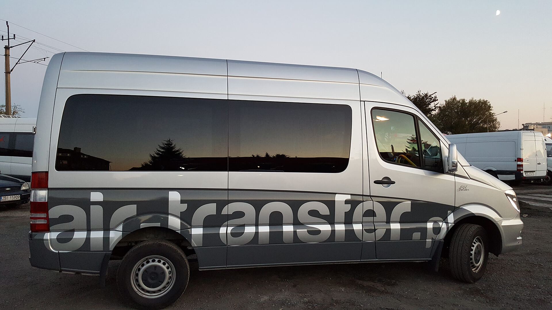 Na samochodzie firmy świadczącej transfery lotniskowe wykonaliśmy oklejenie z wykorzystaniem folii wylewanej. Grafika, precyzyjnie wycięta na ploterze, nadaje pojazdowi elegancki, biznesowy charakter. Czytelne oznakowanie pojazdu ułatwia identyfikację samochodu przez pasażerów na lotniskach i dworcach.