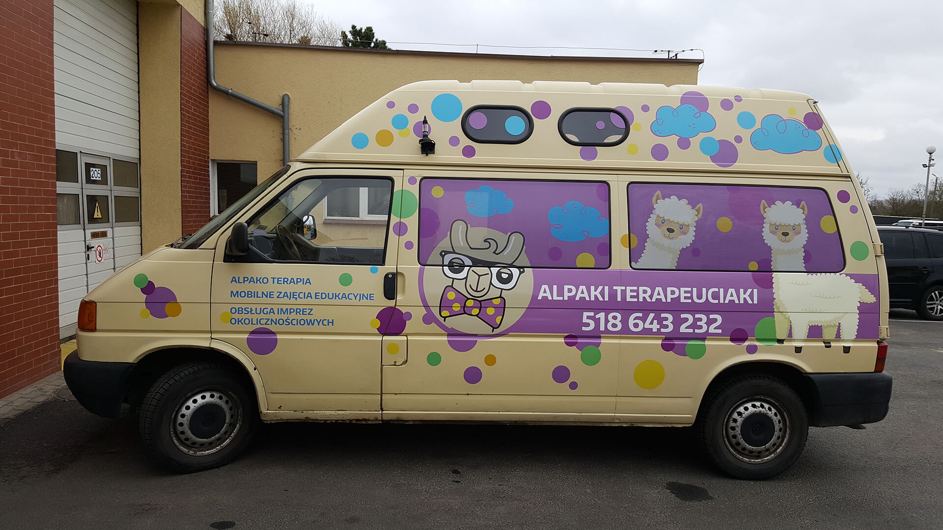 Na samochodzie do transportu alpak wykonaliśmy oklejenie z wykorzystaniem kolorowej grafiki. Wesoły i przyjazny design nawiązuje do charakteru działalności - alpakoterapii. Wyrazista reklama mobilna przyciąga uwagę i promuje wyjątkowe usługi terapeutyczne z udziałem alpak.