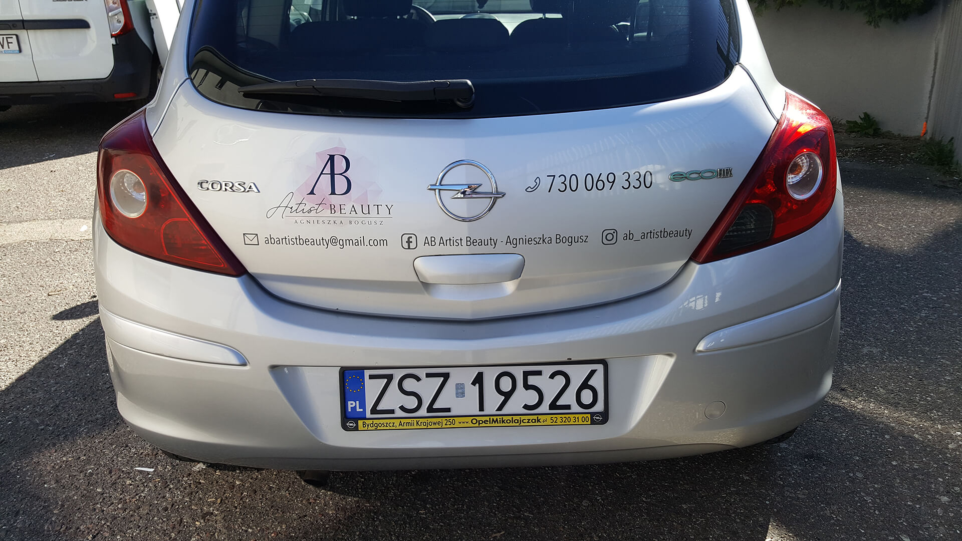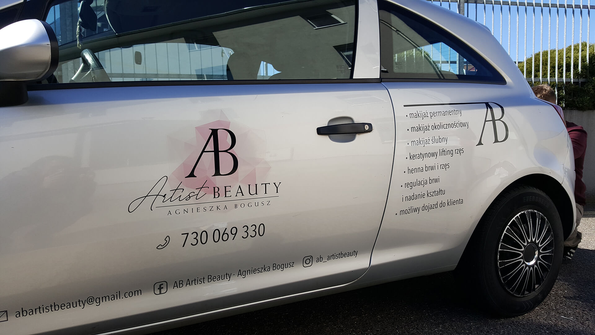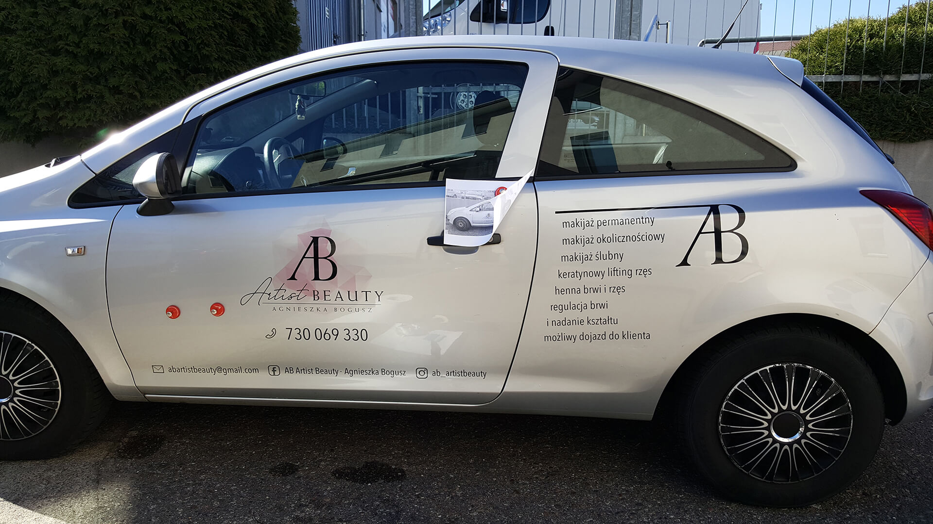 Na samochodzie wykonaliśmy oklejenie łączące zadrukowaną folię przezroczystą z elementami z folii polimerowej. Subtelna, a zarazem efektowna grafika podkreśla charakter salonu kosmetycznego. Profesjonalne wykończenie zapewnia elegancką prezentację marki podczas codziennej eksploatacji.