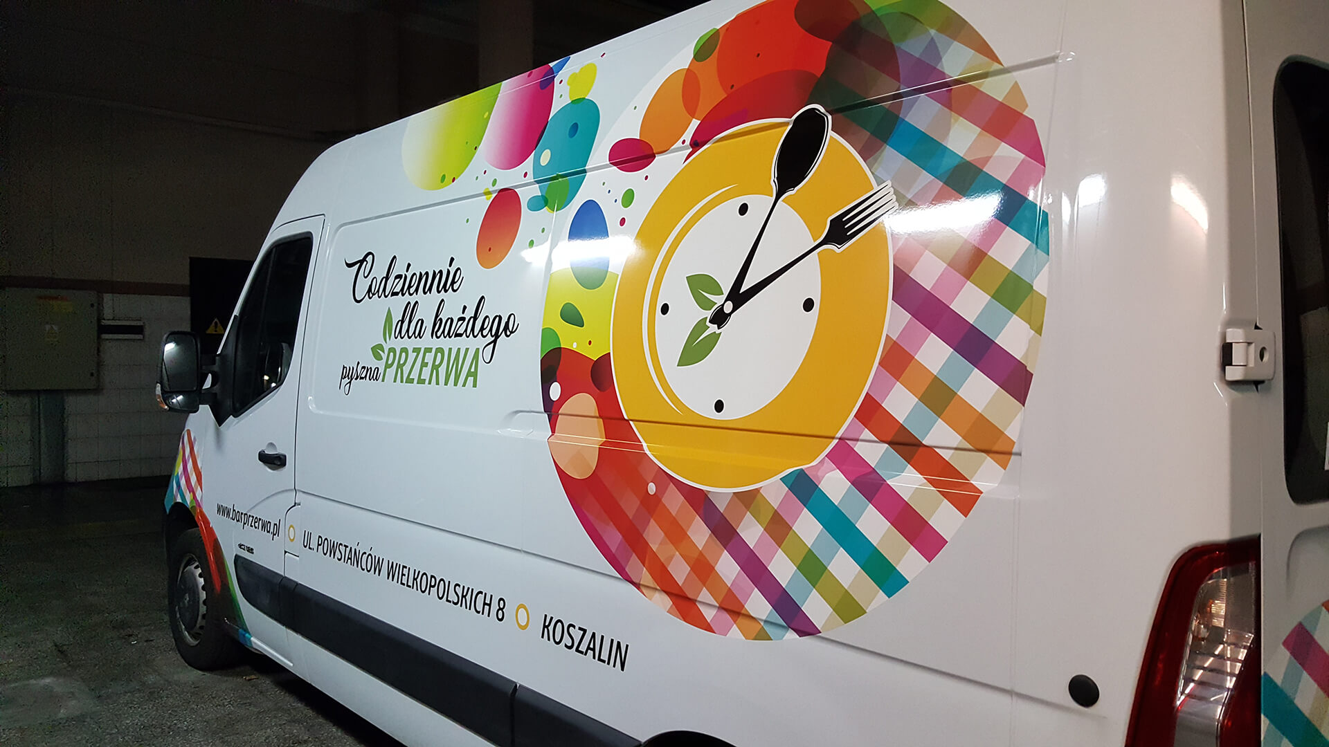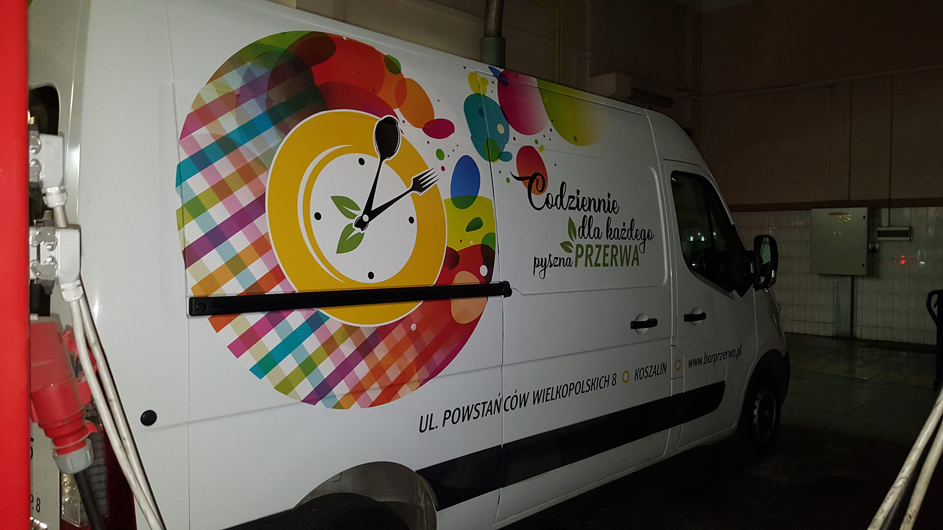 Na samochodzie firmowym lokalu gastronomicznego wykonaliśmy oklejenie reklamowe. Grafika zawiera logo i dane kontaktowe, zachowując spójność z identyfikacją wizualną baru. Mobilna reklama skutecznie promuje usługi gastronomiczne podczas codziennych dostaw.