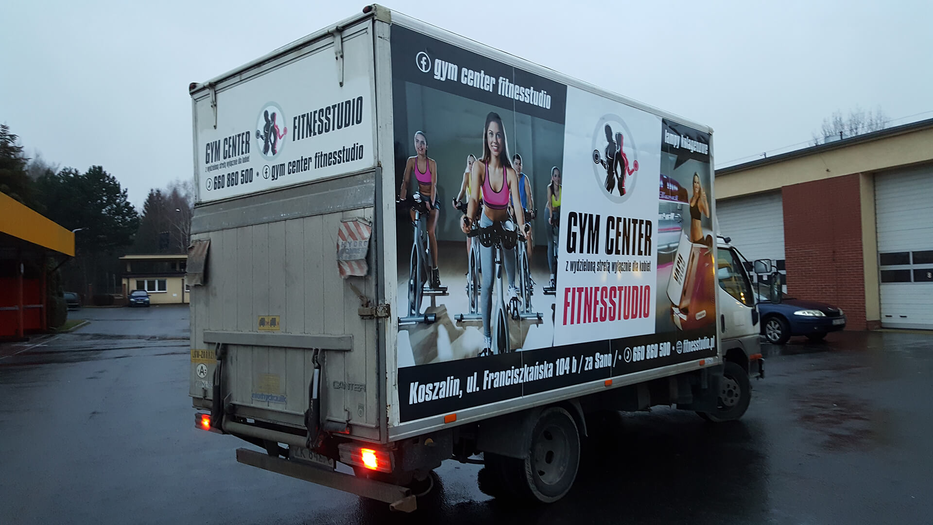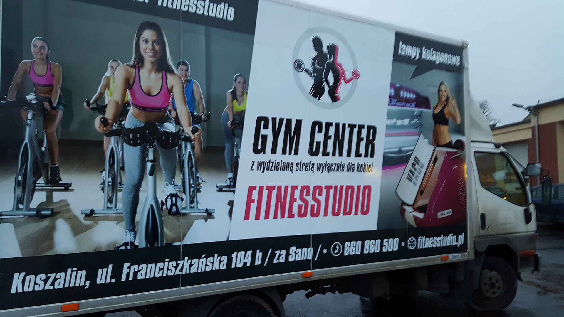 Na samochodzie dostawczym wykonaliśmy oklejenie z wykorzystaniem folii polimerowej zabezpieczonej laminatem. Grafika zawiera dynamiczne elementy nawiązujące do charakteru studia fitness. Wyrazista reklama mobilna skutecznie promuje klub podczas codziennej eksploatacji pojazdu.