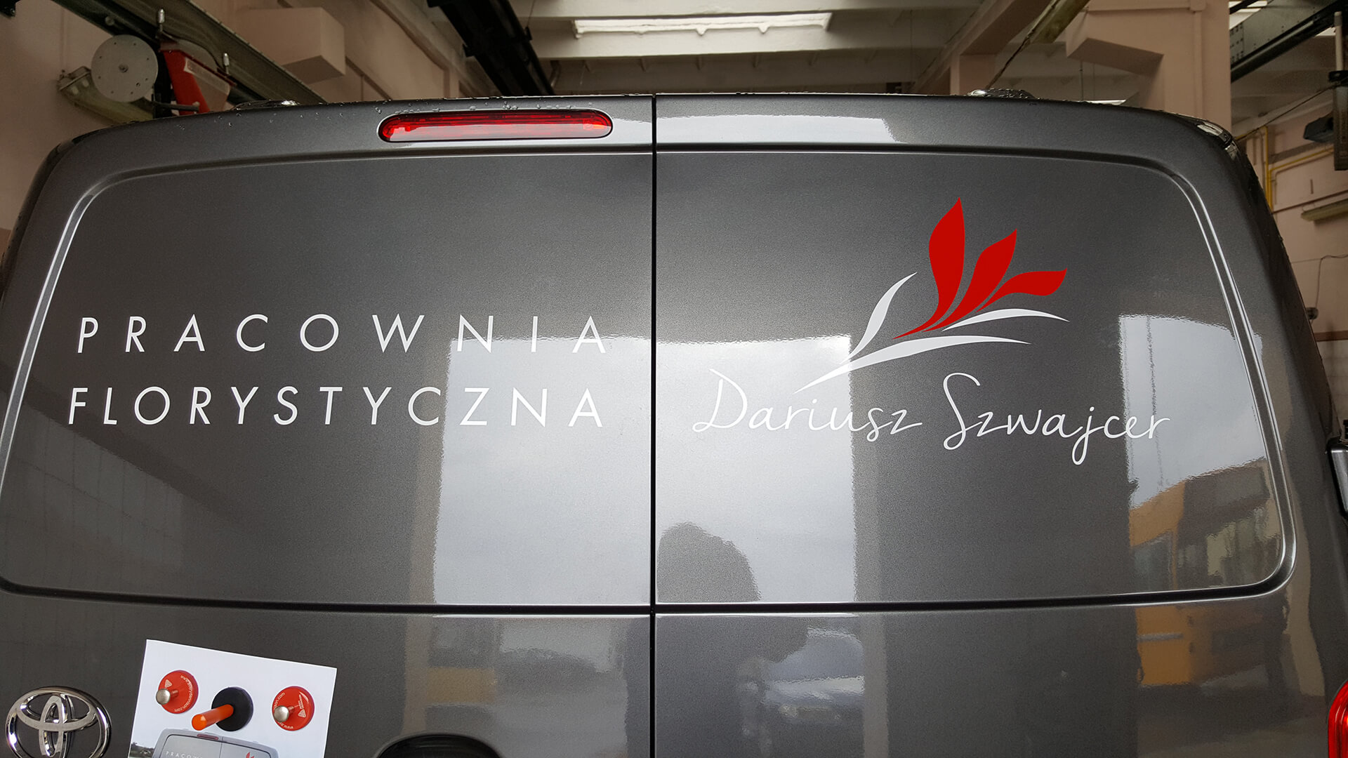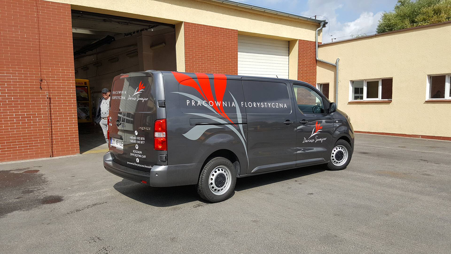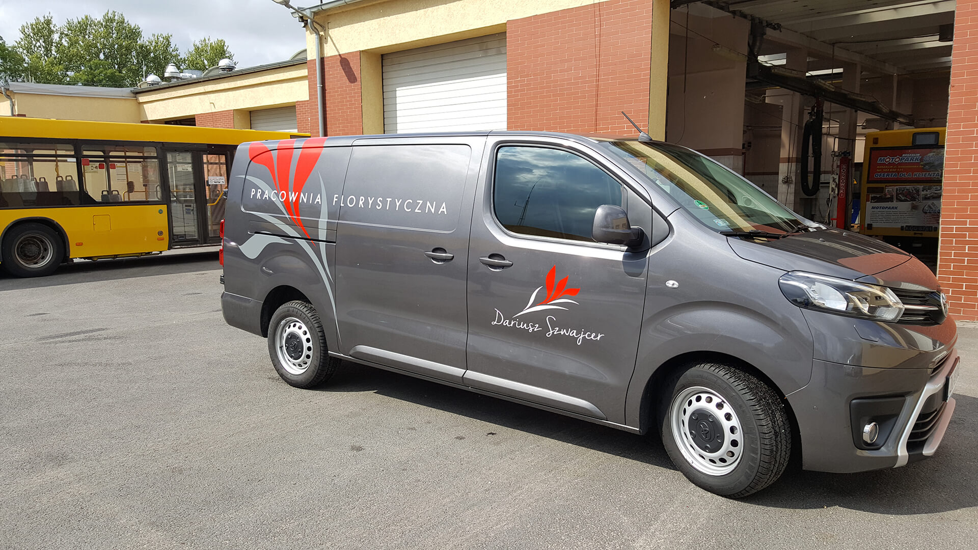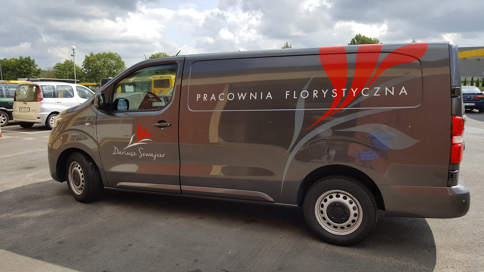 Na samochodzie firmowym wykonaliśmy minimalistyczne oklejenie z wykorzystaniem folii ciętej ploterowo. Głównym elementem kompozycji jest subtelny motyw kwiatowy, płynnie przechodzący przez bok pojazdu. Stonowana grafika doskonale odzwierciedla charakter pracowni florystycznej, zachowując elegancki i profesjonalny wygląd.