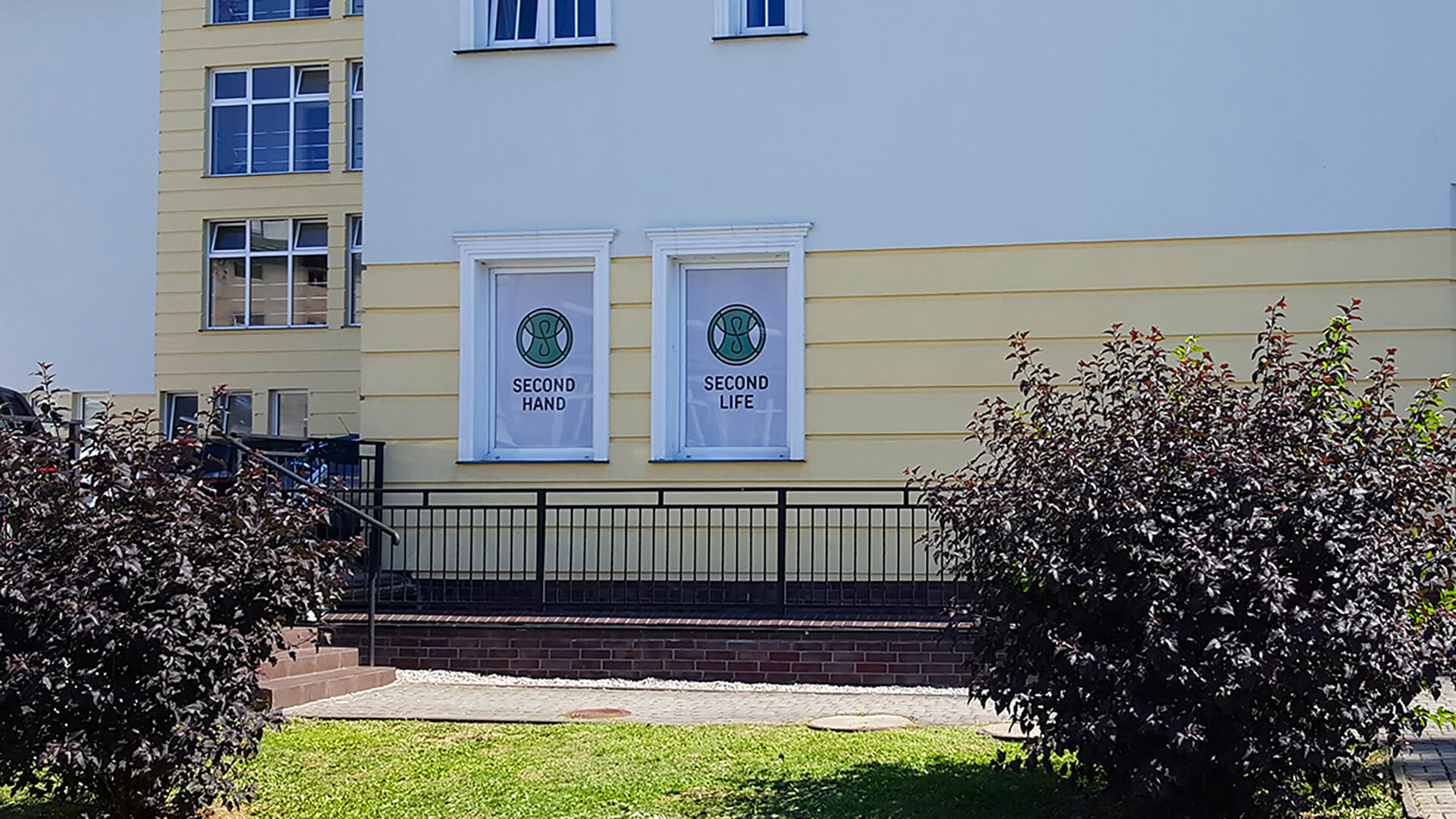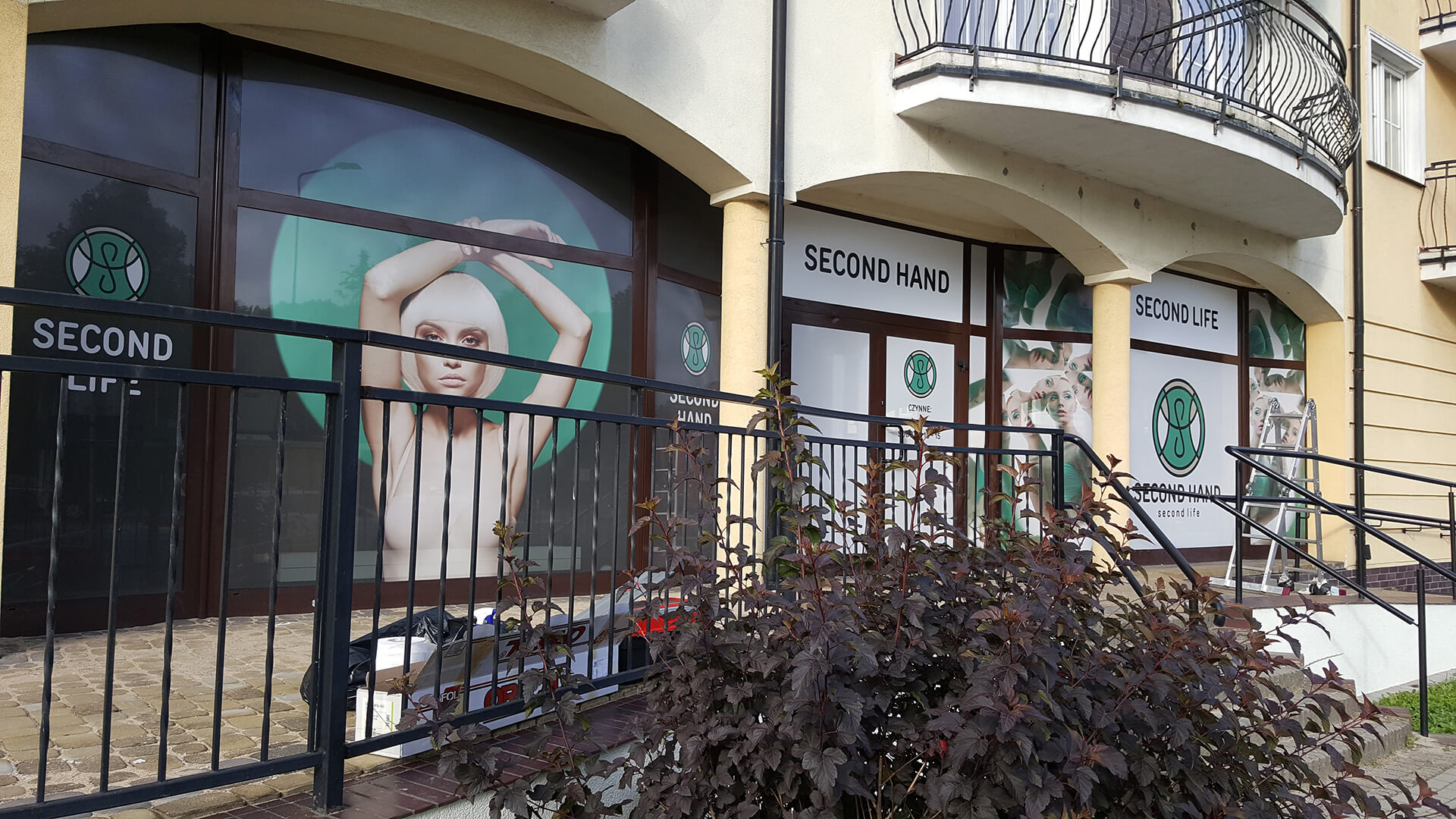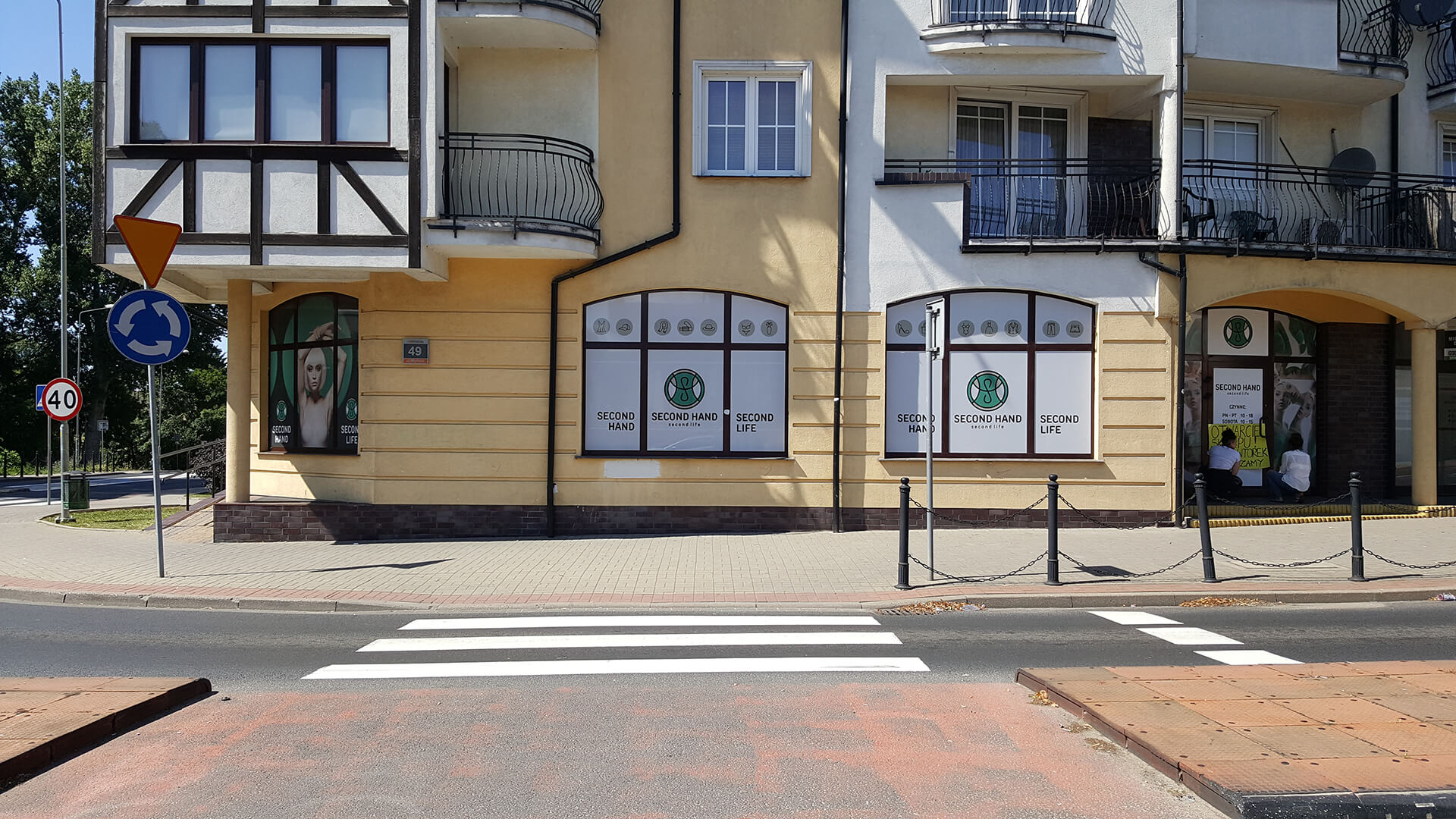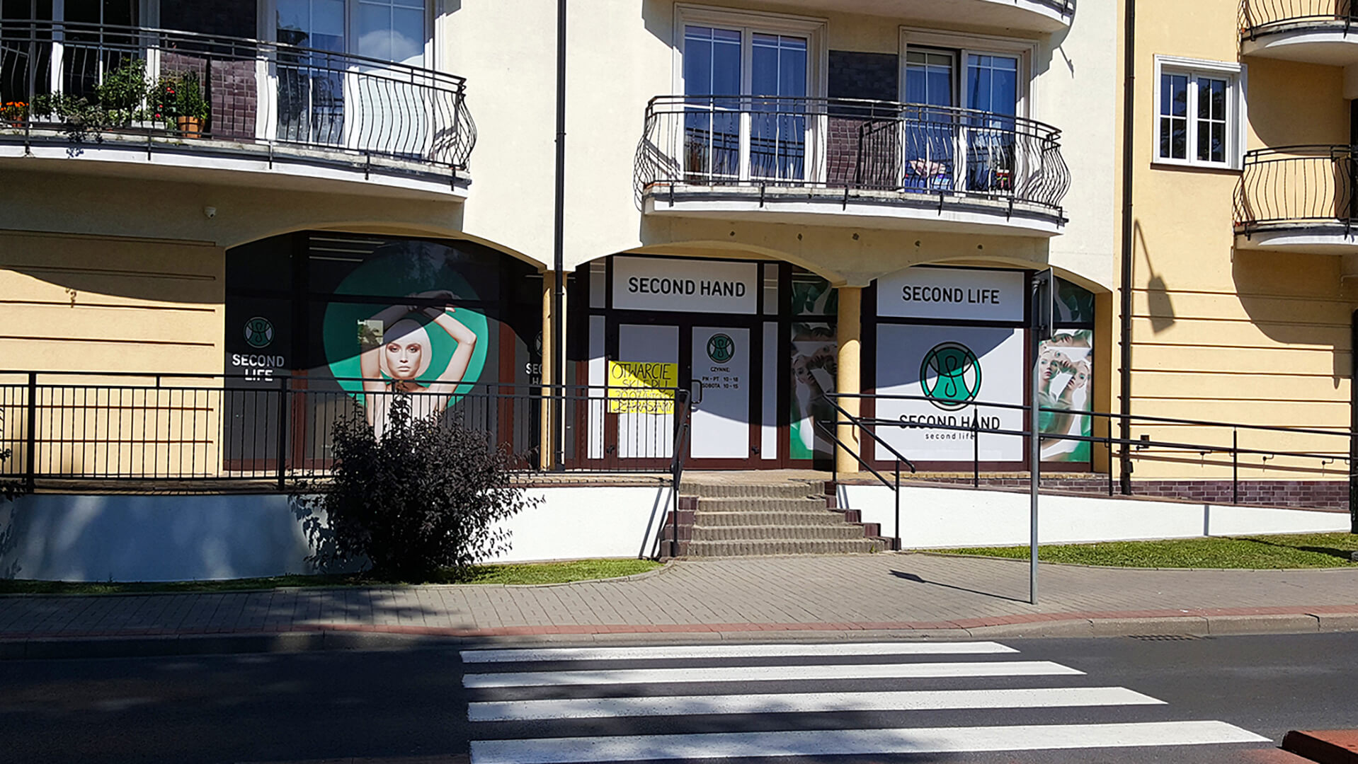 Na szybach sklepu wykonaliśmy oklejenie z wykorzystaniem folii One Way Vision. Materiał zapewnia doskonałą widoczność reklamy od zewnątrz, zachowując przejrzystość szyb od wewnątrz. Grafika skutecznie eksponuje charakter sklepu z odzieżą używaną.