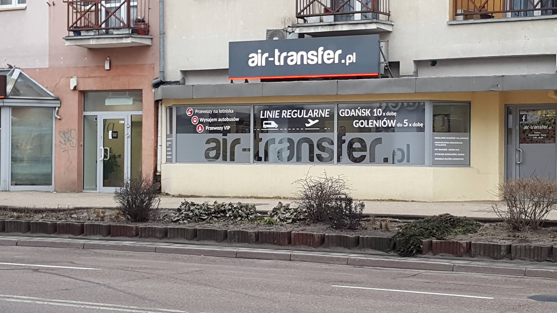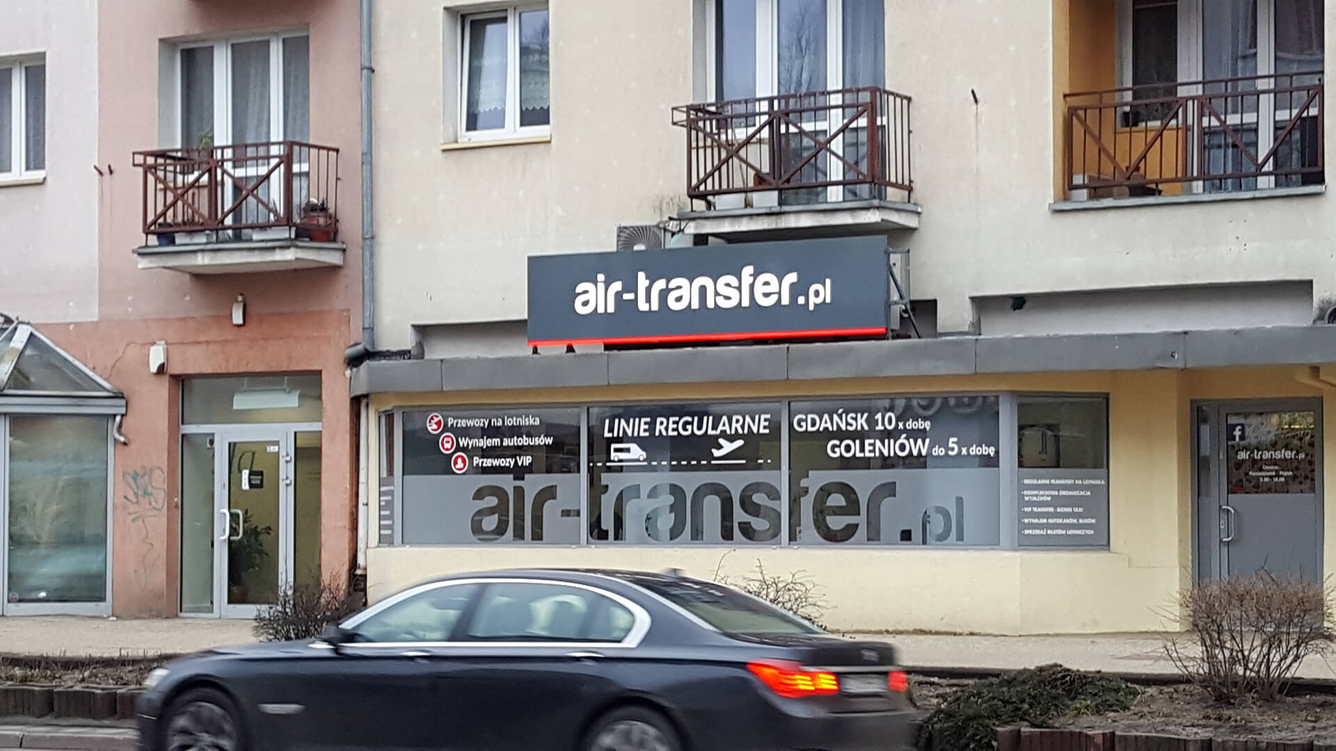 W lokalu firmy zajmującej się przewozami osób wykonaliśmy kompleksowe oznakowanie. Głównym elementem jest efektowny kaseton z dibondu z nowoczesnym podświetleniem liniowym. Na witrynach zaaplikowaliśmy folię mrożoną, uzupełnioną precyzyjnie wyciętymi napisami z folii ploterowej. Całość tworzy profesjonalną identyfikację wizualną punktu obsługi klientów korzystających z transferów lotniskowych.