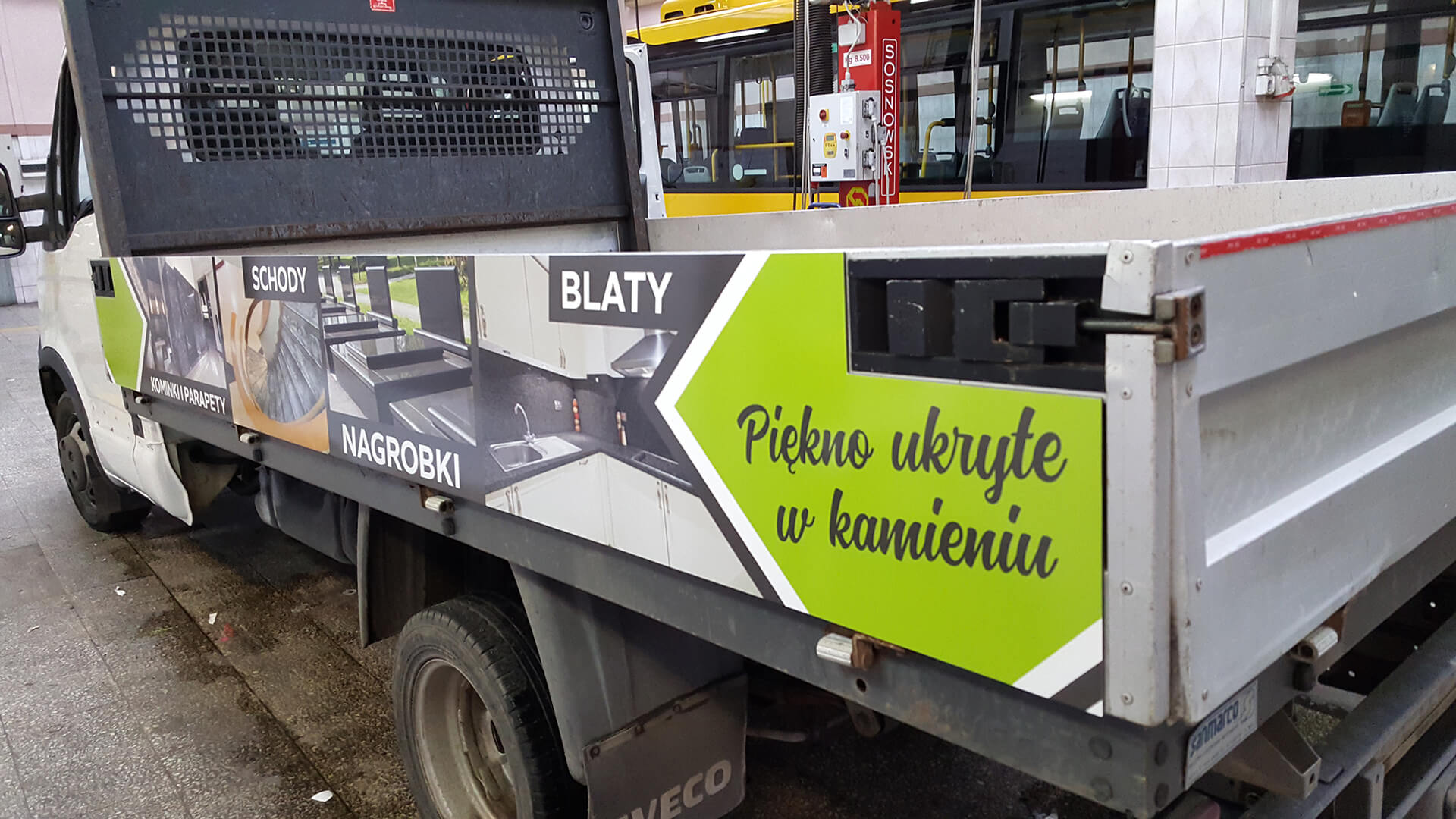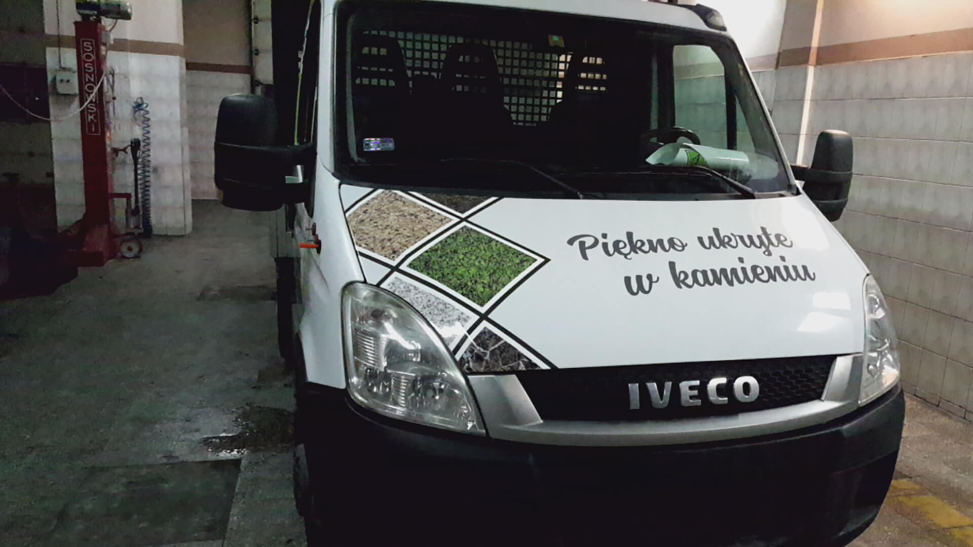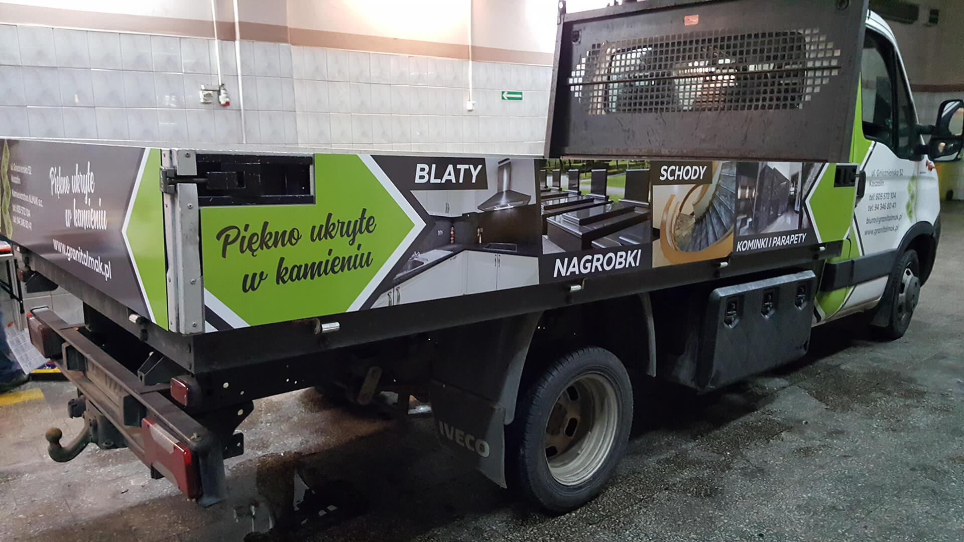 Na samochodzie firmy kamieniarskiej wykonaliśmy dwuetapowe oznakowanie. Na burtach zamontowaliśmy panele z dibondu z aplikacją zadrukowanej folii polimerowej. Kabinę pojazdu wyróżniliśmy oklejeniem z charakterystycznymi dla firmy motywami. Połączenie tych technik pozwoliło uzyskać efektowną, trwałą reklamę mobilną dla zakładu kamieniarskiego.