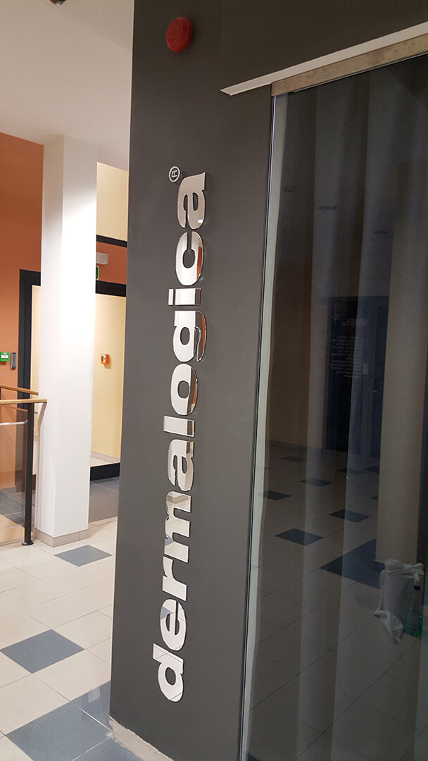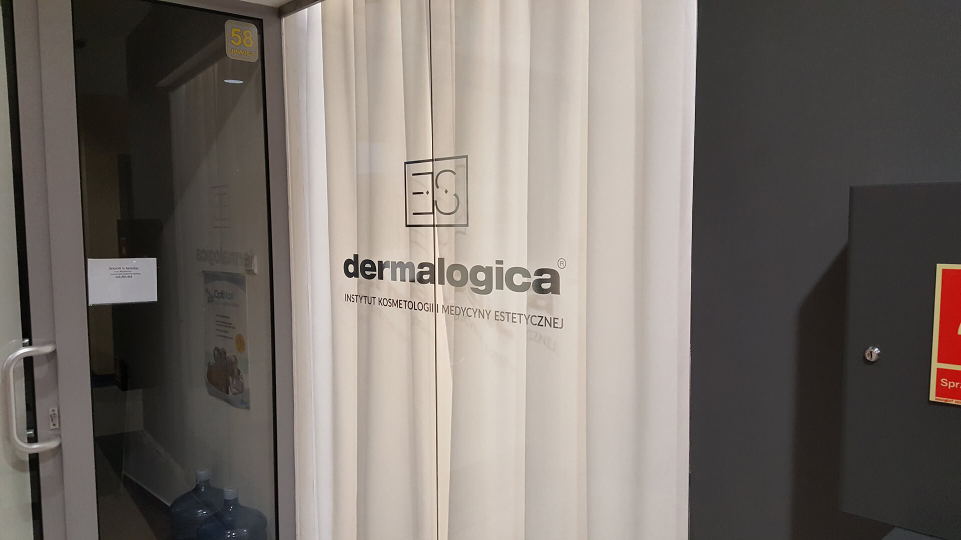 W salonie kosmetycznym wykonaliśmy system oznaczeń z wykorzystaniem ekskluzywnych materiałów. Na ścianie zamontowaliśmy logotyp z pleksi lustrzanej, a szyby zostały wykończone folią w srebrnym, lustrzanym kolorze. Połączenie tych elementów nadaje wnętrzu prestiżowy charakter, podkreślając wysoką jakość oferowanych zabiegów.