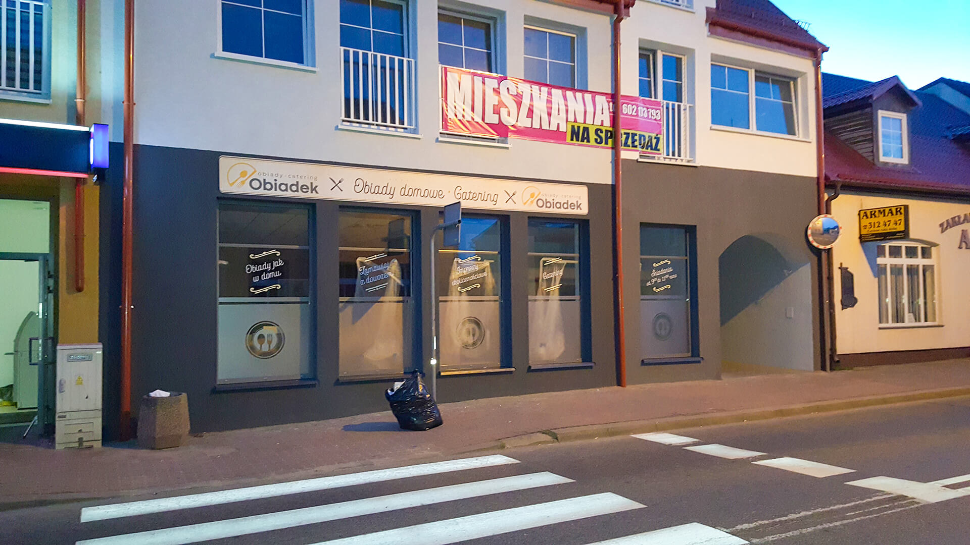 Na witrynach lokalu gastronomicznego wykonaliśmy oklejenie folią mrożoną z elementami graficznymi. Całość uzupełnia szyld z dibondu zamontowany na elewacji. Połączenie dyskretnego wykończenia szyb z wyrazistym szyldem tworzy spójną identyfikację wizualną baru.