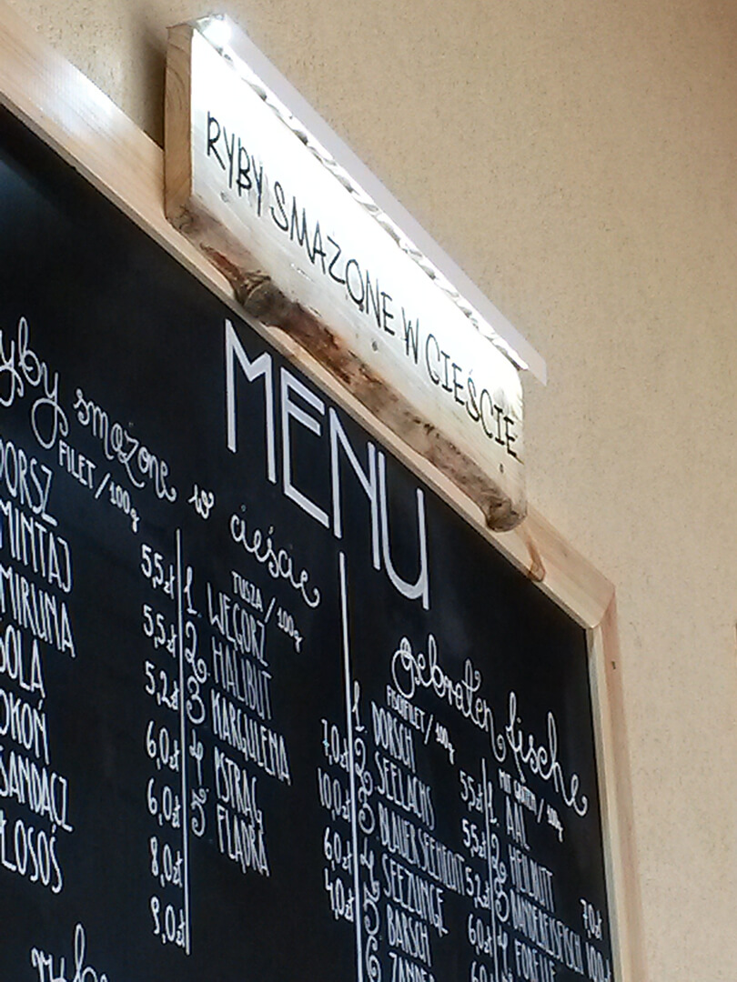 Wykonaliśmy system tablic menu pokrytych specjalną folią tablicową, umożliwiającą swobodne pisanie kredą. Takie rozwiązanie pozwala na bieżącą aktualizację oferty i cen w zależności od dostępności świeżych ryb. Praktyczne i estetyczne wykończenie tablicy idealnie komponuje się z nadmorskim charakterem smażalni, a możliwość szybkiej zmiany menu to duża zaleta w sezonie letnim.